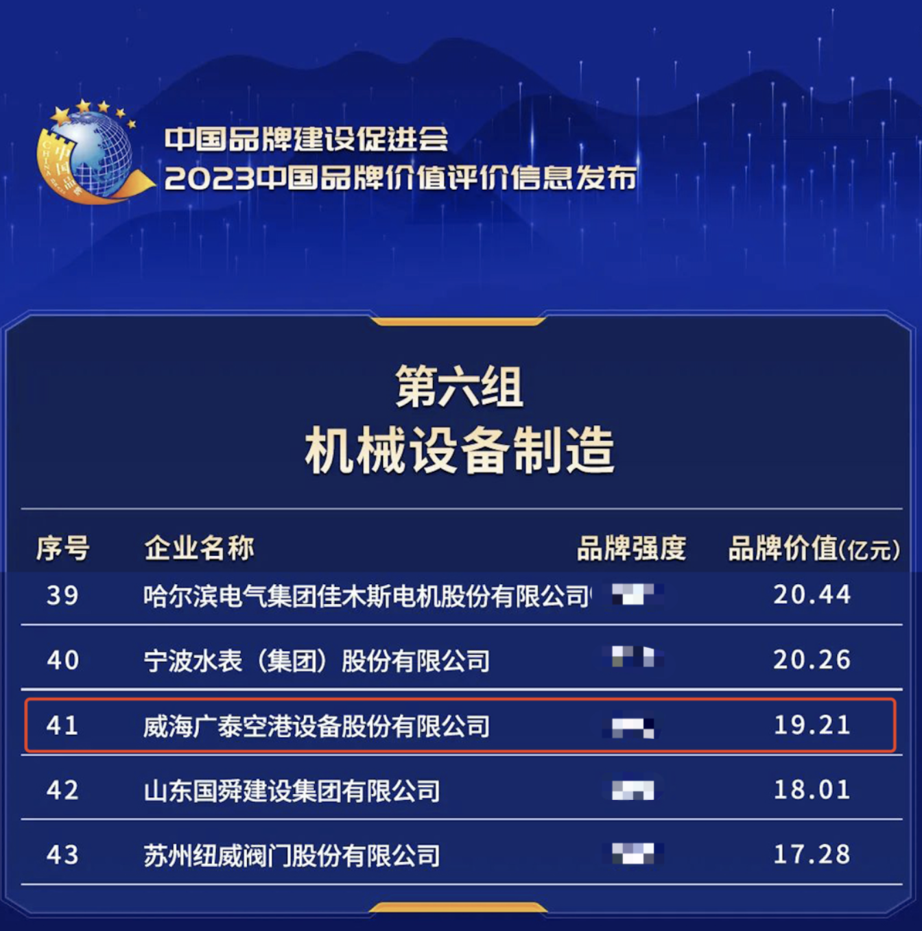 2023年5月11日,新華社、浙江省人民政府、中國品牌建設促進會、中國資產評估協會等單位在浙江德清聯合發布“2023中國品牌價值評價信息”。威海廣泰空港設備股份有限公司(簡稱“威海廣泰”)在此次發布評價機械設備制造組中,品牌價值獲評為19.21億元。“中國品牌價值評價信息發布”…